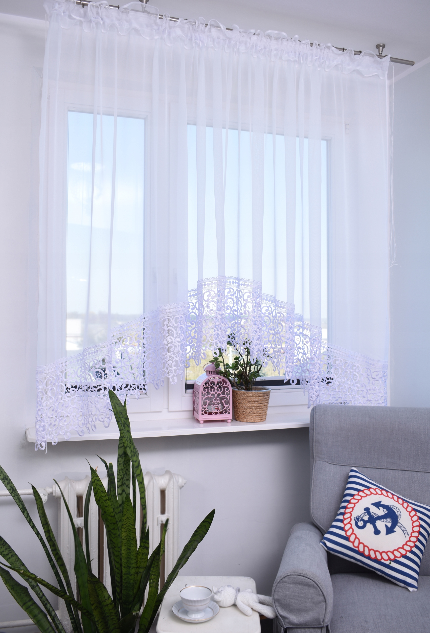 Hvit blondegardin som er sydd i en bue og vakkert pyntet nederst med intrikate guipureblonder. Den har et universaltape på toppen, noe som gir mulighet for allsidig montering på enten gardinstenger eller kroker. I tillegg gjør båndet det mulig å justere stoffets bredde, slik at det passer perfekt til vinduet ditt.